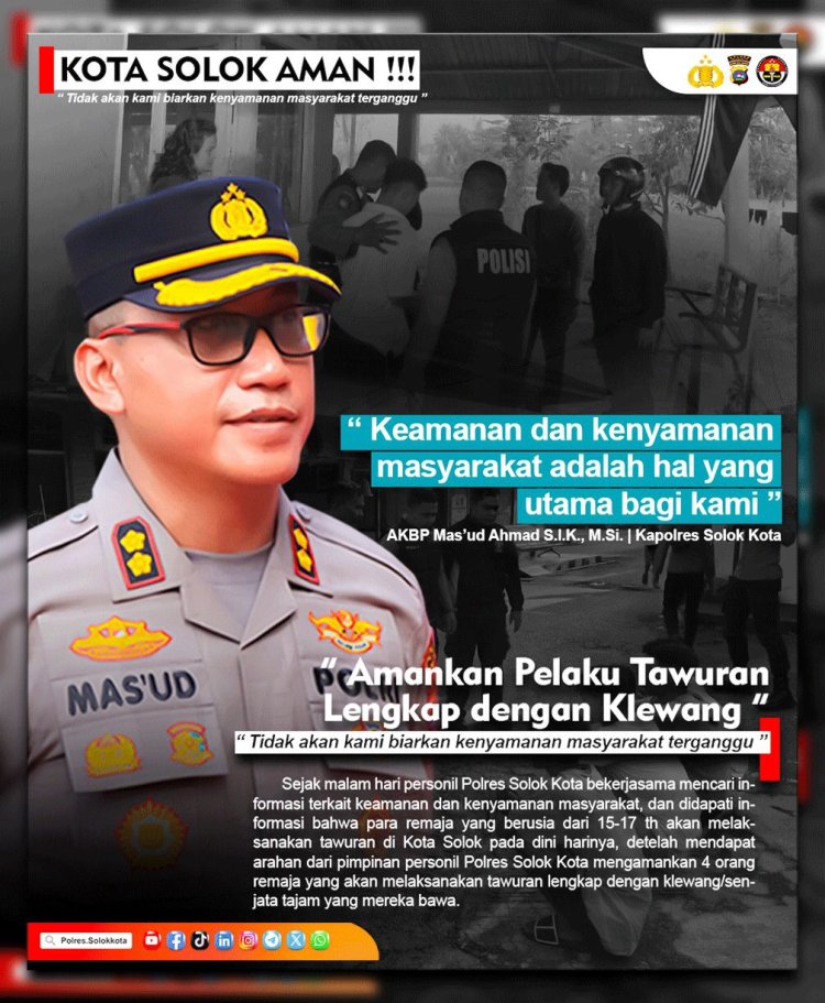 "Kami ingin Kota Solok yang kita cintai ini terbebas dari kekerasan jalanan. Aksi tawuran dan balap liar tidak hanya membahayakan pelaku, tetapi juga mengancam keselamatan masyarakat luas. Maka kami jajaran Polres Solok Kota akan terus melakukan penindakan tegas terhadap siapa saja yang dapat mengancam keselamatan masyarakat," ujar AKBP Mas’ud Ahmad.