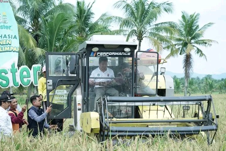 HORIZONE- Bupati Sambas H. Satono melakukan panen raya padi khusus pada kelompok tani Trikarya desa Serunai, Kecamatan Salatiga, Kabupaten Sambas, Provinsi Kalimantan Barat, Sabtu ( 16/9/2023 ).