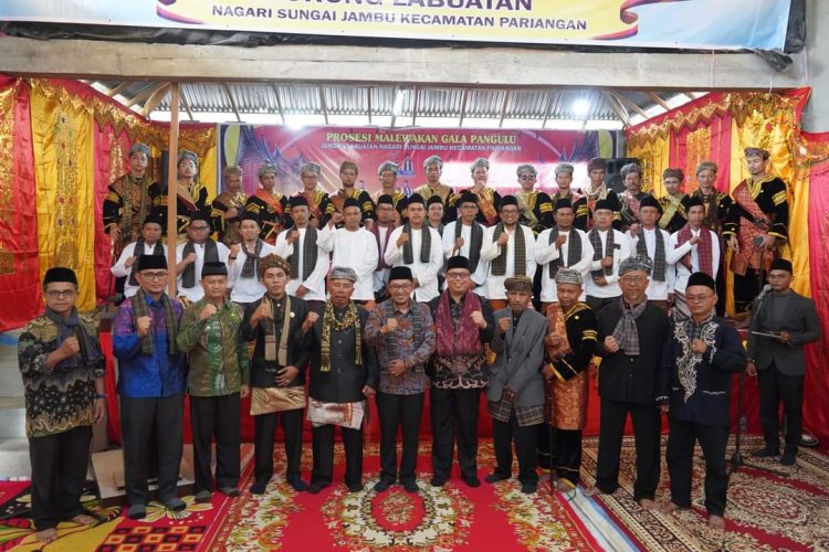 HORIZONE - Nagari Sungai Jambu, Kecamatan Pariangan, Kabupaten Tanah Datar baralek gadang. Sebanyak 17 orang dari tujuh suku dilewakan gala pangulu. Momen yang sangat dinantikan oleh masyarakat ini diselenggarakan pada Minggu (14/4/2024) di Gedung Pemuda, Jorong Labuatan nagari setempat .
