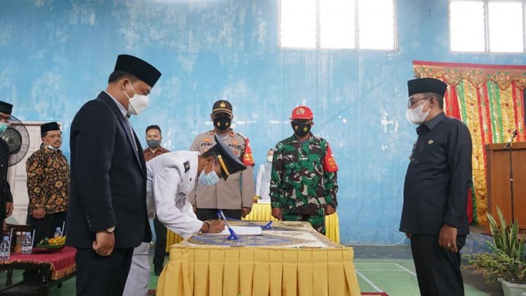 Camat Tanjung Emas Zulkifli Idris tandatangani berita acara Sertijab dihadapan Bupati Tanah Datar Eka Putra, Kamis (7/10/2021)