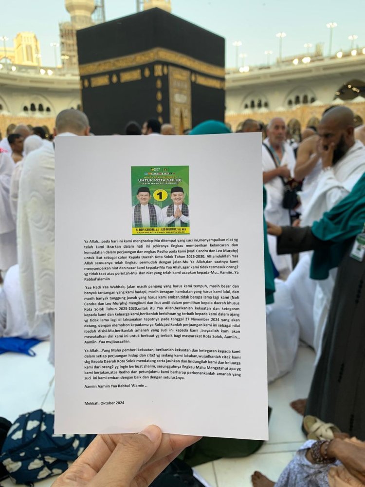 Atas histori pergulatan panjang dan perjuangan mendapatkan dukungan partai itulah, kemudian Nofi Candra akhirnya menebus janji ke tanah suci. Ia berangkat umroh bersama isrri, setelah memastikan dirinya bersama Leo Murphy mendapatkan nomor Urut 1 sebagai Calon Walikota dan Wakil Walikota Solok.