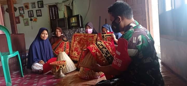 Saat berkunjung, Kopda Sony Surya mengamati pengrajin tenunan sulaman benang emas yang sedang menyulam penutup baju Carano.