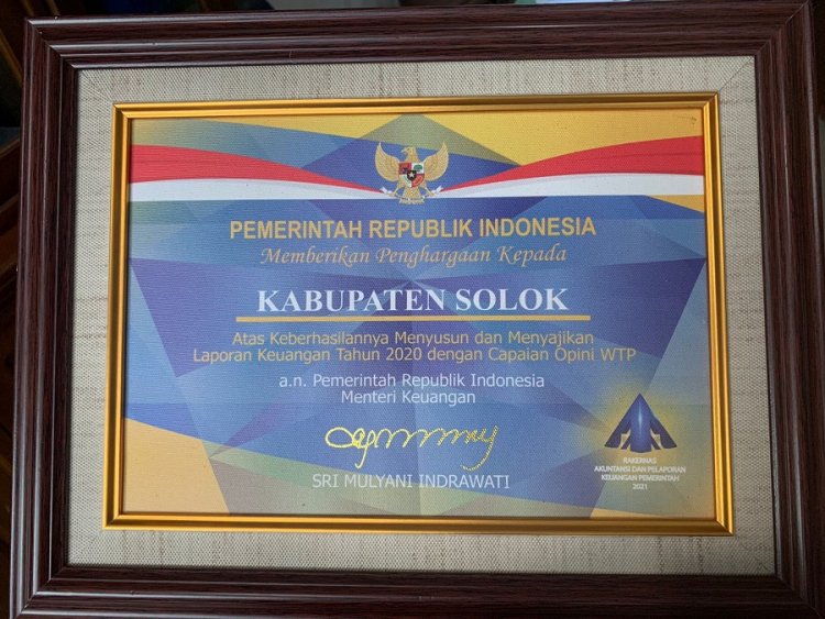 HORIZONE- Pemerintah Kabupaten Solok mendapatkan penghargaan piagam Opini Wajar Tanpa Pengecualian (WTP) Laporan Keuangan Pemerintah Daerah (LKPD) Tahun 2020.