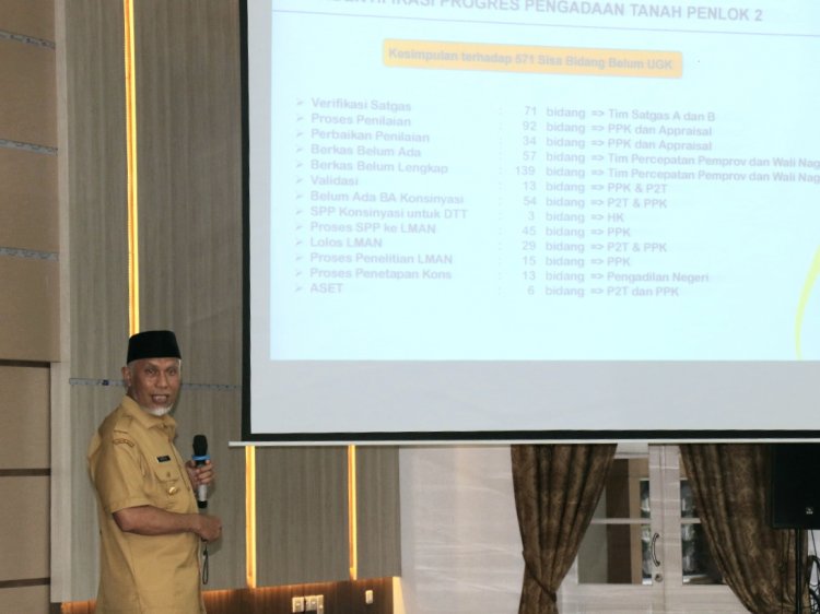 "Pembebasan percil baru 64 persen lebih, hanya 24 persen lebih penambahannya sejak 2021. Untuk fisiknya, baru 9 Km dari 20,5 Km. Masalahnya apa? Kalau dari 571 percil ini, masalahnya bukan di kami lagi. Sudah berapa bulan ini? Kita targetkan lebih cepat lagi selesainya pembebasan tanah ini. Harus ada time schedule nya yang jelas, makanya kita rapat hari ini," tegas Buya Mahyeldi.