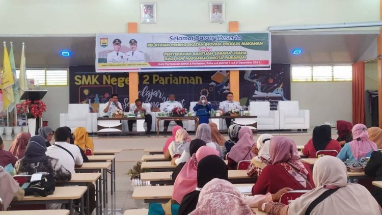 HORIZONE - Untuk meningkatkan pengetahuan dan SDM pelaku usaha IKM (Industri Kecil dan Menengah), Dinas Perindustrian Perdagangan Koperasi dan Usaha Kecil Menengah (Perindagkop dan UKM) Kota Pariaman, gelar Pelatihan Peningkatan Inovasi Produk IKM Makanan selama tiga hari, mulai Rabu hingga Jum’at (1-3/12/2021), di Aula SMK N 2 Pariaman.
