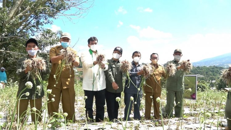 Gubernur Mahyeldi bersama Bupati Tanah Datar Eka Putra, Kepala Balai Besar Litbang Sumber Daya Lahan Pertanian Husnain, anggota DPRD Sumbar Panen Perdana Bawang Merah hasil budidaya Pengembangan dan Riset Inovatif Kolaboratif (PRIK) di Jorong Pagu-pagu, Selasa (21/9/2021).