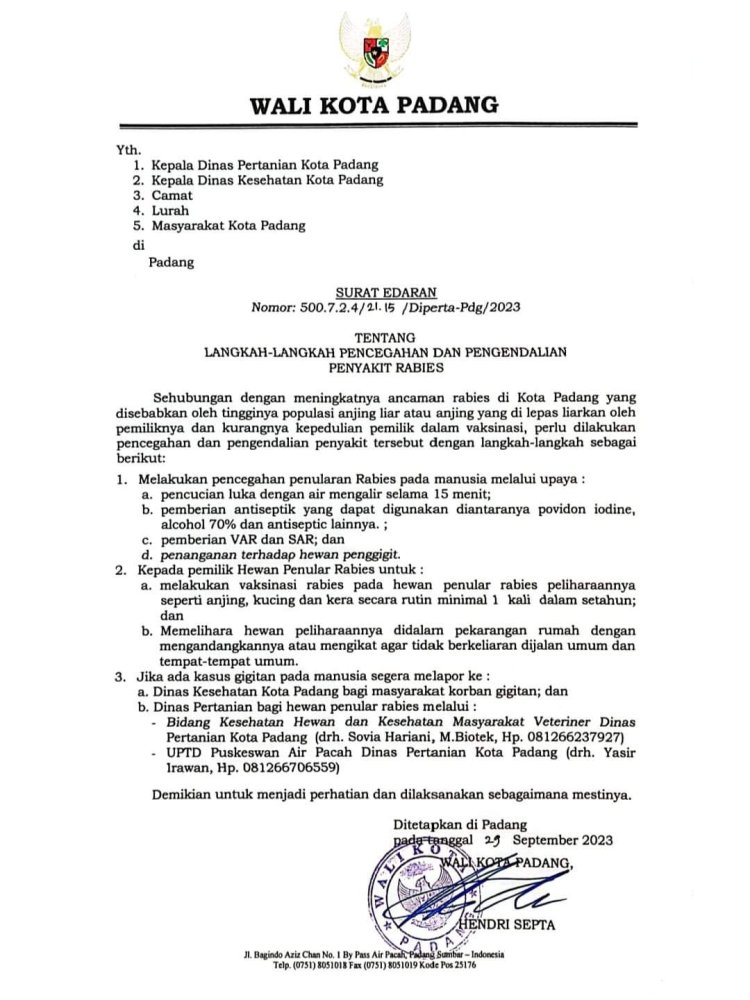 Terkait Anjing Gila Wali Kota Padang Terbitkan Surat Edaran