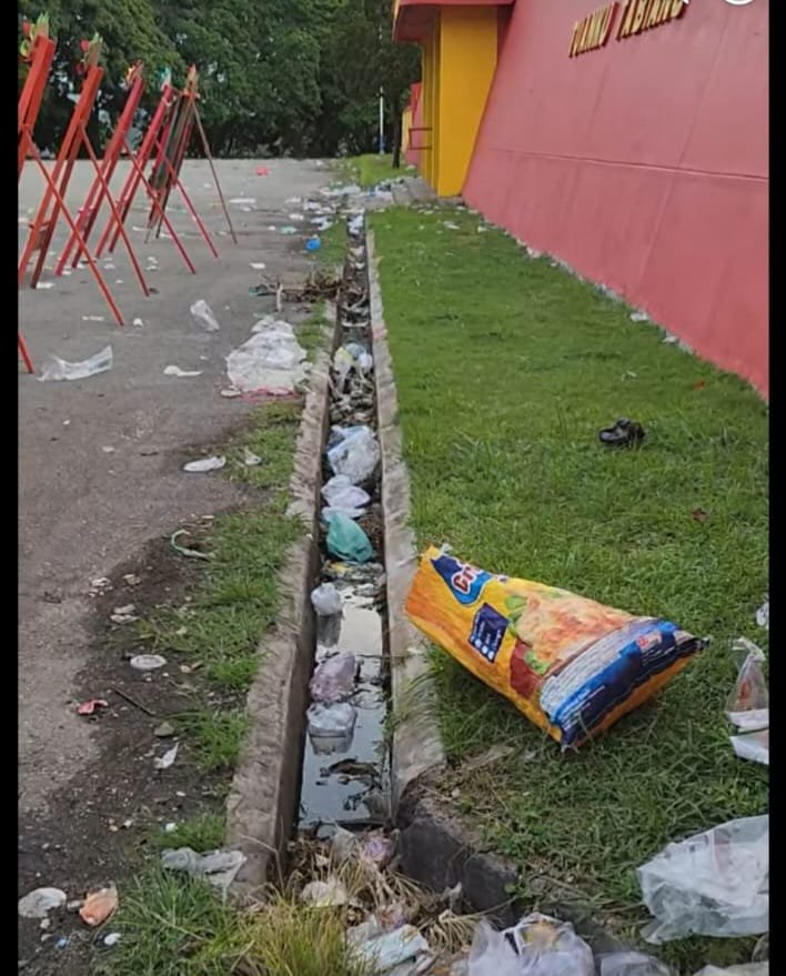 Sejauh ini, sudah tiga hari pula usai ramai-ramai di lapangan yang menjadi ikon Kabupaten Solok itu, ronanya belum berubah sampai Rabu (24/12/2025). Sampah berserakan dimana-mana. Dilapangan, di tribune terbuka, bahkan dalam saluran air. Sampah jenis plastik, kertas bekas bungkus makanan dan botol-botol sisa minuman menyumbat aliran air. Memprihatinkan!